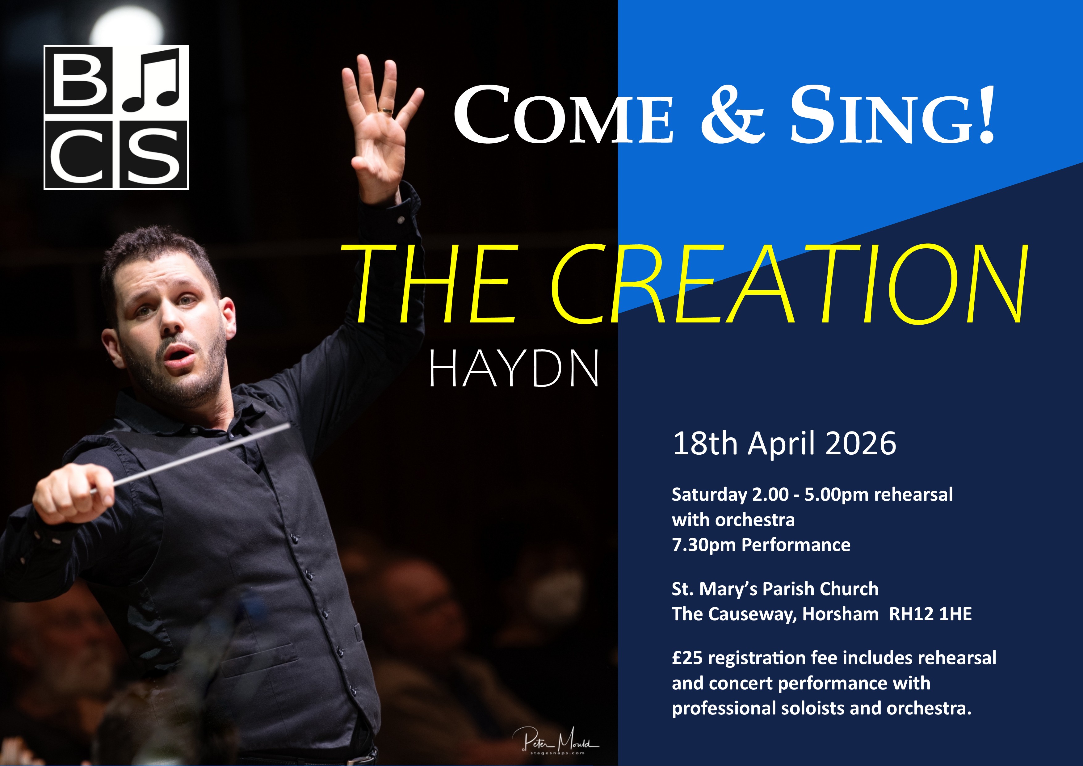 If you are a keen singer, but cannot commit to a weekly rehearsal, why not join us for our ‘Come and Sing’ event and concert on Saturday, 18th of April 2026? You can rehearse Haydn’s Creation during the day at St. Mary’s Parish Church in Horsham and take part in the concert that evening. The choir will be conducted by Marcio da Silva, the Music Director of BCS and a prominent name in the classical music world.